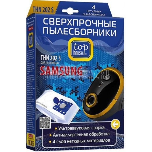 TOP HOUSE THN 202 S Сверхпрочные нетканые пылесборники с антибактериальной обработкой, 4 шт. для пылесосов SAMSUNG, VITEK, BORK, HOTPOINT-ARISTON, GORENJE, MIDEA, ARIETE, BIMATEK, ROLSEN, BEKO, DIRK DEVIL/ROYAL, REDMOND, SCARLETT, SINBO, VAX, ZANUSSI, DAEWOO, PRINCESS. Соответствуют оригинальным типам пылесборников: VP-95B и VP-77. Изготовлены из многослойного нетканого материала Micro-Fleece на одном из лучших заводов в Германии - Aichner-Filter GmbH. Обеспечивают уровень фильтрации воздуха в 99,98%.