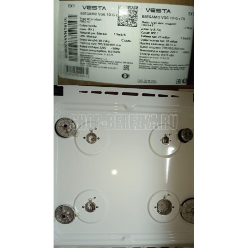 Горелки стола: Газовые – 4 шт. Газ.Контроль - Полный. Мощность горелок рабочего стола: Горелка передняя левая/правая – 2,0/2,4 кВт. Горелка задняя левая/правая – 2,0/1,0 кВт. -Мощность горелки духовки – 2,5 кВт. -Объем духовки в литрах: 65 л. Верхний/нижний нагреватель духовки – газ. Газ-контроль полный. Решетка рабочего стола – сталь. Крышка рабочего стола – стекло. Термометр духовки. Кнопка электророзжига горелок стола. Электрическая подсветка духовки. Противень – 2 шт. В/Ш/Г 850/600/600