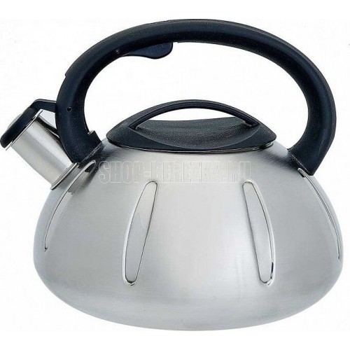 WEBBER BE-0569/1 Объем 3 л., Толщина стенок 0,6 мм. Чайник из нержавеющей стали со свистком. Высококачественная нержавеющая сталь. Матовая сатиновая полировка. Индукционное дно. Нейлоновая ручка с кнопкой открывания носика. Цвет ручки и крышки: черный. Пригоден для использования на всех типах кухонных плит, включая индукционные.