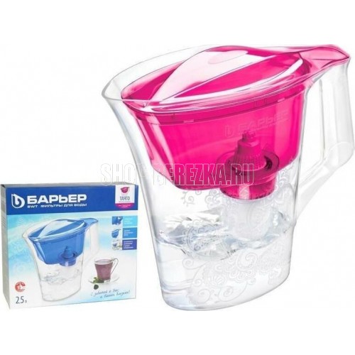 Кувшин ТАНГО с узким корпусом и элегантным рисунком BOSKO, возможность размещения в дверце холодильника, возможность мыть в посудомоечной машине, объем кувшина 2,5 литра, объем воронки 1 литр. Кассета Барьер Лайт в комплекте, ресурс кассеты 200 литров, кассета предназначена для доочистки водопроводной воды от хлора, органических и неорганических примесей, устраняет неприятные запахи и привкусы.
