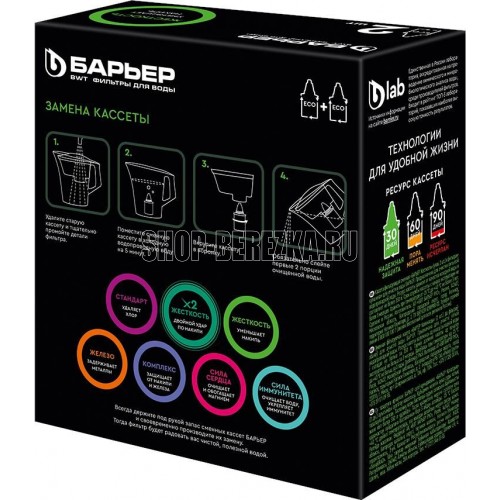 Количество в упаковке 2 Ресурс, л 350 Проблема воды Жесткая вода Тип очищаемой воды Питьевая водопроводная Срок хранения, мес 36 Размеры упаковки, ДхШхВ 129x64x146мм Срок хранения, мес 36 Вес, кг 0.3 Очищает воду от солей жесткости, которые мы привыкли встречать в жизни в виде накипи в чайнике, кофе-машине и налете на кухонном кране. Кассета БАРЬЕР Жесткость снижает образование накипи, а также удаляет основные вредные примеси, оставляя только свежую чистую воду. Ресурс каждой кассеты — 350 литров. С фильтрами БАРЬЕР вам не придется запоминать размер или диаметр сменной кассеты: любая кассета БАРЬЕР подходит ко всем фильтрам-кувшинам БАРЬЕР. А герметичное резьбовое соединение исключает попадание неочищенной воды в отфильтрованную. Ресурс зависит от качества исходной воды, но составляет не более 350 литров для каждой кассеты.