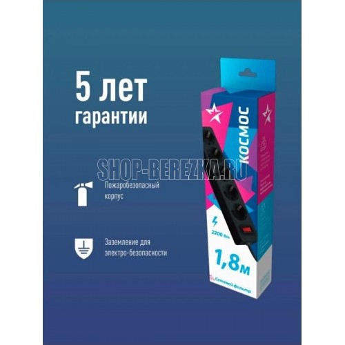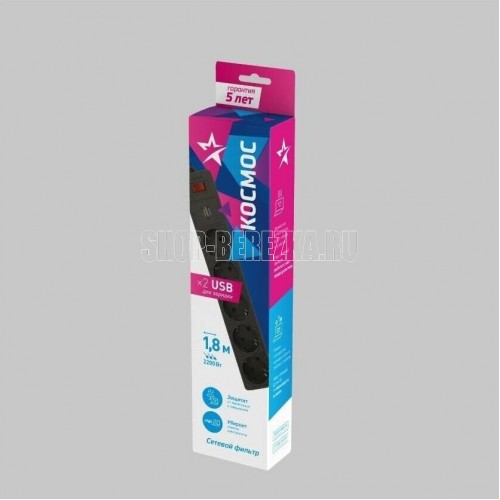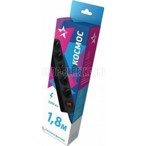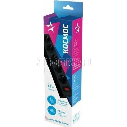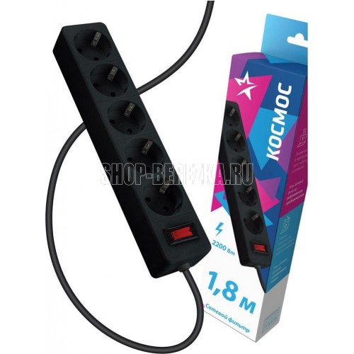 Сетевой фильтр(варистор,терморазмыкатель),1,8м, на 5 гнезд с заземлением, сечения провода - 3*0,75мм2,Медь 100%,Индикатор сети. Номинальный ток 10А, максимальная мощность - 2200Вт.