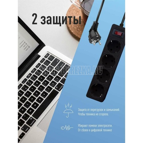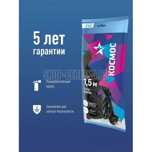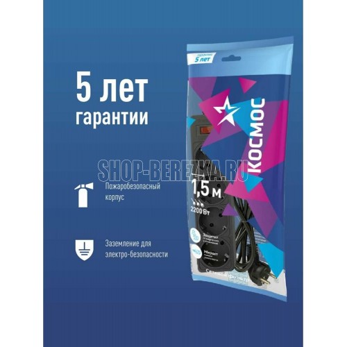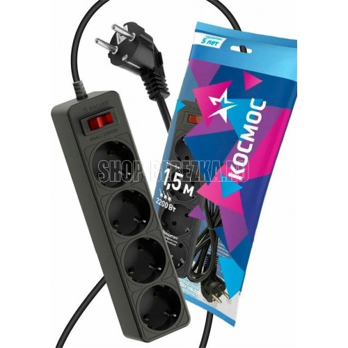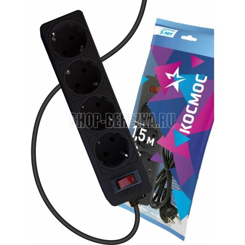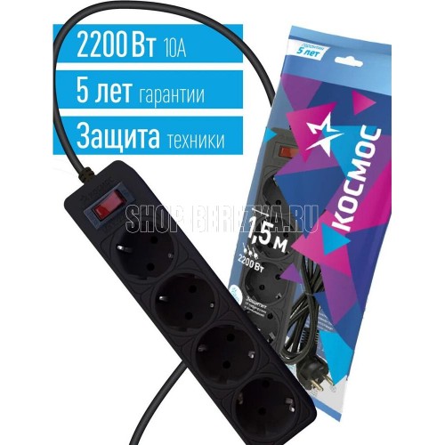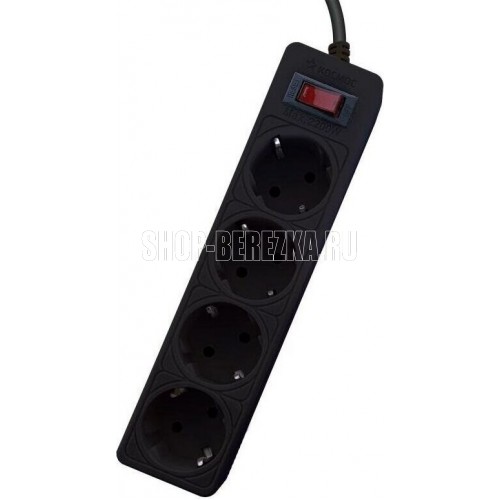 Сетевой фильтр чёрный на 4 гнезда с заземлением. Диаметр сечения провода - 3*0,75мм2. Индикатор сети. Номинальный ток 10А, максимальная мощность - 2200Вт. 5 лет гарантии