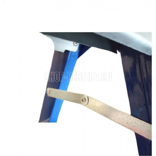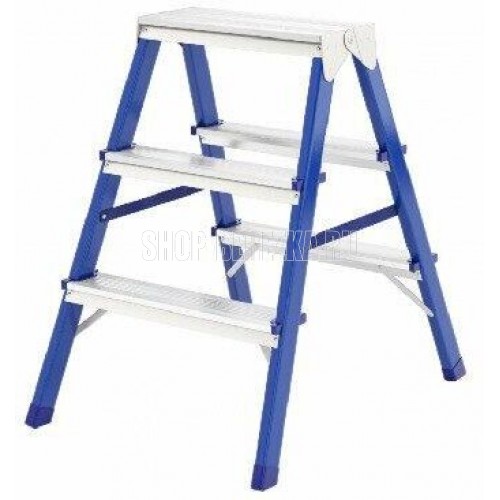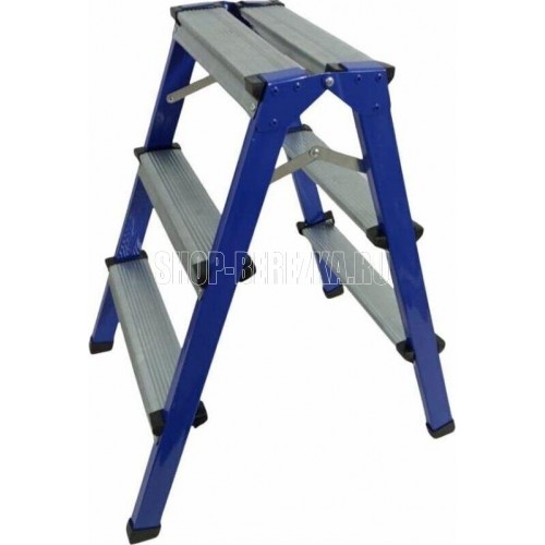 Складная стремянка с окрашенным порошковой эмалью стальным профилем оснащенным ступеньками с двух сторон и верхней рифленой противоскользящей площадкой которое можно использовать как сидение.страховочные ремни для дополнительной устойчивости и предотвращения складывания и пластиковые наконечники на ножках предотвращающие скольжение высота ступеньки 64 см габариты в сложенном виде 71х44х16 предельно допустимая нагрузка 150 кг с учетом динамической нагрузки. Цвет в ассортименте (синий, красный, серебристый)