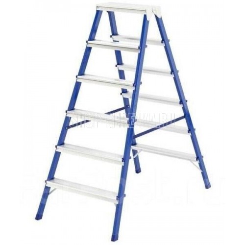 Складная стремянка с окрашенным порошковой эмалью стальным профилем оснащенным ступеньками с двух сторон и верхней рифленой противоскользящей площадкой которое можно использовать как сидение.страховочные ремни для дополнительной устойчивости и предотвращения складывания и пластиковые наконечники на ножках предотвращающие скольжение высота ступеньки 129 см габариты в сложенном виде 140х51,5х16 предельно допустимая нагрузка 150 кг с учетом динамической нагрузки. Цвет в ассортименте (синий, красный, серебристый)