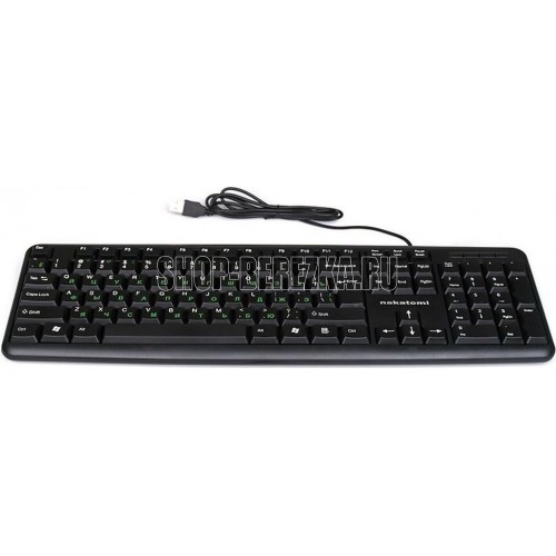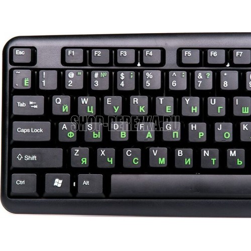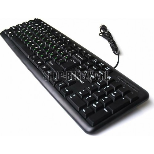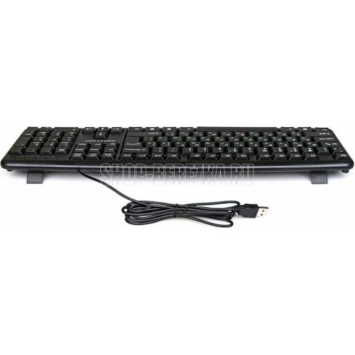Интерфейс: USB, Корпус: Пластик, черный. Латиница - белый цвет, кириллица - зеленый, Количество клавиш: 104, Клавиши Windows, Регулируемый угол наклона, Длина кабеля, м: 1.5.