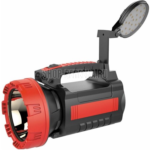 Фонарь-прожектор, 1 светодиод мощностью 10 Вт + 24 светодиода мощностью 4,8 Вт / аккумулятор 4000 mAh 4V / время заряда: 8 ч / время непрерывной работы: 6-11 ч / материал корпуса: пластик / цвет корпуса: красный/чёрный / индивидуальная цветная коробка