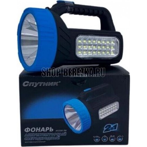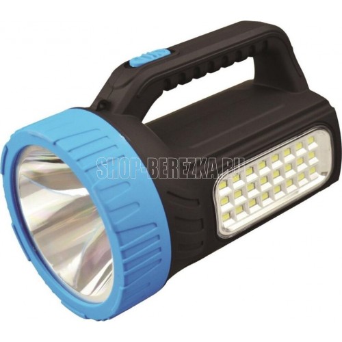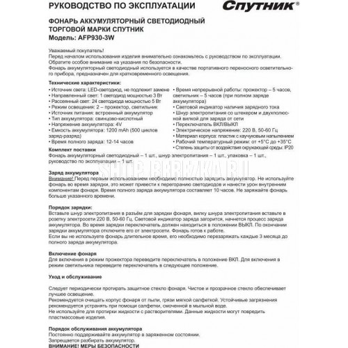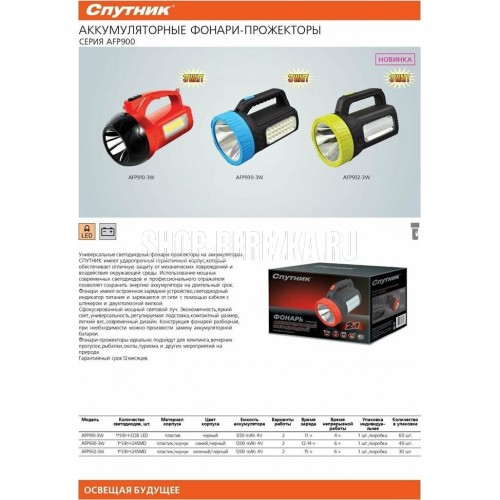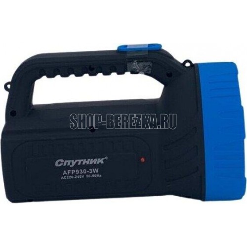 AFP930-3W прожектор+светильник / 1 LED мощностью 3 Вт + 24 SMD LED мощностью 4,8 Вт / аккумулятор 1200 mAh 4V / время заряда: 12-14 ч / время непрерывной работы: до 5 ч / материал корпуса: пластик с каучуковым напылением / цвет корпуса: чёрный/голубой / индивидуальная цветная коробка