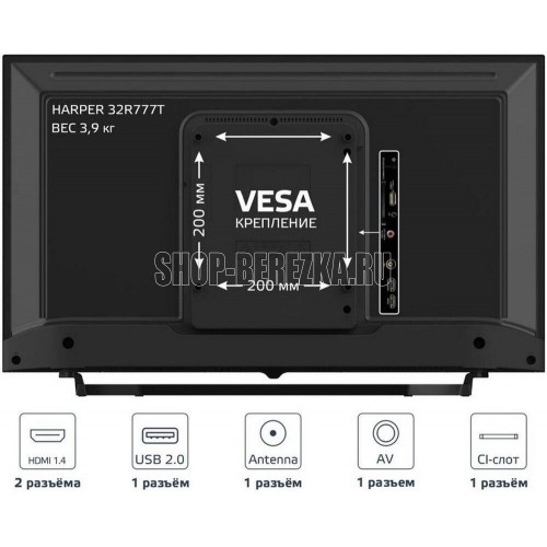 "Диагональ экрана 32"" (81 см)HD frameless Системы цветности аналогового ТВ: SECAM, PAL Цифровой тюнер DVB/T2/C Декодеры стереозвука NICAM, А2, АСЗ Формат изображения: 16:9 Разрешение экрана 1366х768 Динамический контраст 70000:1 Яркость 230 кд/м2 Угол обзора (гор/верт) 178°/178° Цифровой 3D фильтр Количество цветов 16,7 млн. Время отклика 6,5 мс Меню на русском , английском языках Телетекст Аудио 2 х 6 Вт Входы/выходы: Антенный вход Композитный AV вход mini 2 х HDMI 1 х USB CI слот SPDIF (СОАХ) Питание: Напряжение 1 ОО-240В ~ 50/60Гц Максимальная потребляемая мощность 48 Вт Потребляемая мощность в режиме ожидания - 0,5 Вт Удельная мощность рабочего режима: 0,017 Вт/кв.см Потребляемая мощность в выключенном режиме: О Размеры с подставкой: 724х480х180 мм Размеры без подставки: 724х434х84 мм Вес: 3,9кг VESA: 200х200 мм"