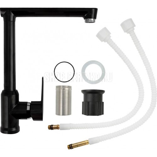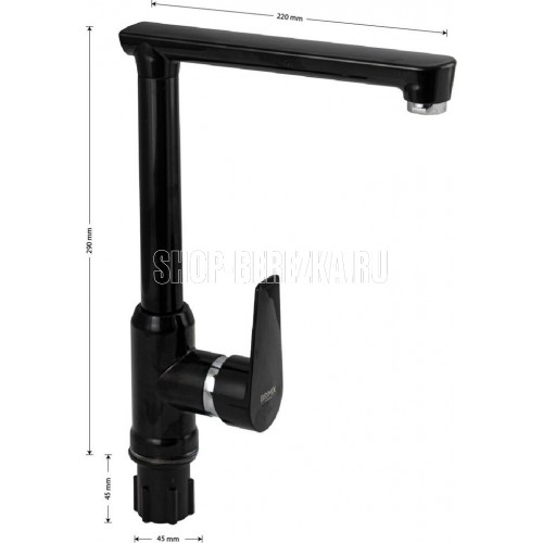 Смеситель для кухонной мойки и раковин, из высокопрочного пластика АБС, ЧЁРНЫЙ, боковой, с высоким Г-образным изливом, шаровый. Крепление резьба - гайка, картридж d = 40 мм, литая хромированная ручка. Хромированный аэратор для экономии воды. Габаритные размеры: высота 290 мм, длина 220 мм, диаметр посадочного седла 45 мм, длина резьбы 45 мм, длина подводки 450 мм. Вес - 0,730 кг, объём - 0,00550 м3. В комплекте паспорт, корпус с изливом, пластиковая подводка с латунными штуцерами 1/2, крепеж, набор прокладок.