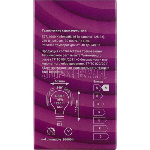 | ОБЩИЕ | Лампа REV E27 A60 16Вт 4000K |