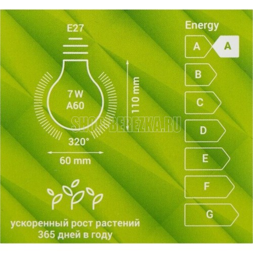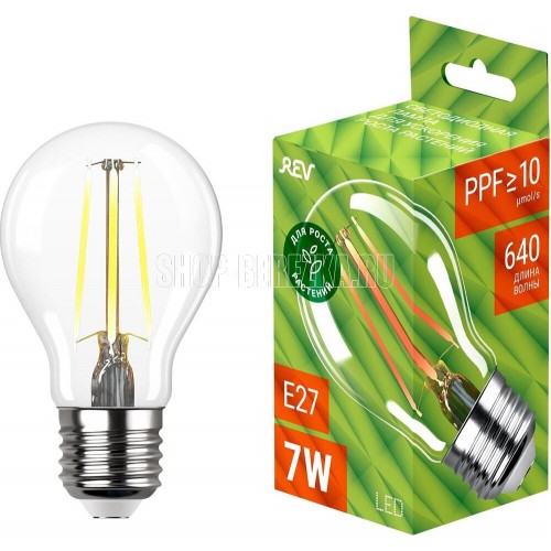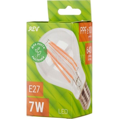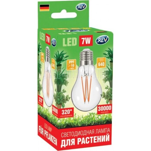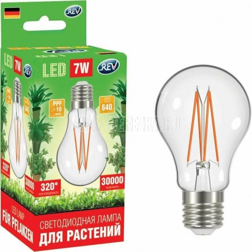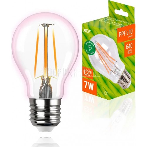 Светодиодная лампа для растений. Цоколь - E27. Потребляемая мощность - 7Вт. Срок службы - 3000ч. Тип лампы - LED филамент.