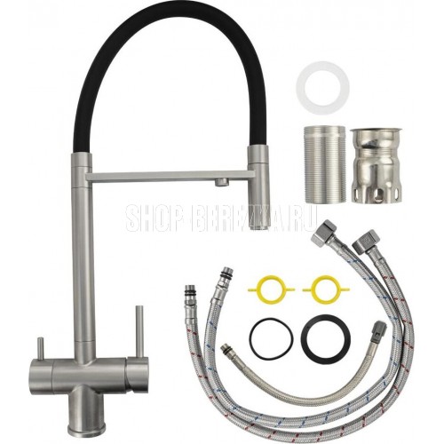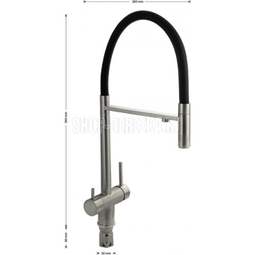 Смеситель для кухонной мойки и раковин с двойным выпуском воды для фильтра, литой матовый корпус, из нержавеющей стали марка 304, с высоким С-образным гибким изливом чёрного цвета, шаровый. Крепление резьба - гайка, картридж d = 40 мм, ручка шток. Аэратор для экономии воды. Такая модель может использоваться на домашней кухне, на даче, в медицинских учреждениях и общественных местах. Габаритные размеры: высота 560 мм, длина 260 мм, диаметр посадочного седла 50 мм, длина резьбы 60 мм, длина подводки 500 мм. Вес - 2,76 кг, объём - 0,01300 м3. В комплекте паспорт, корпус с изливом, подводка 1/2, крепеж, набор прокладок