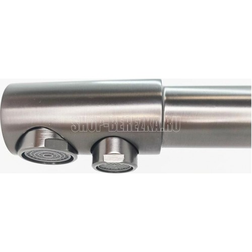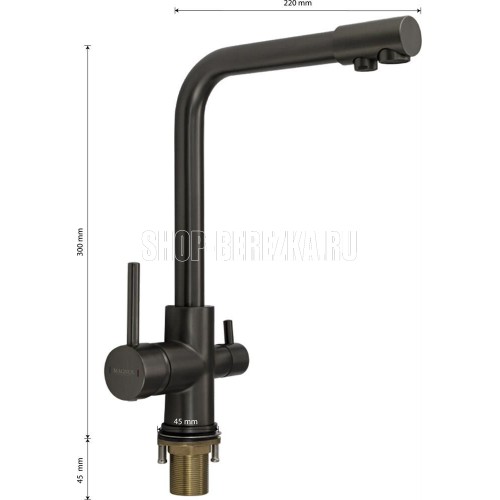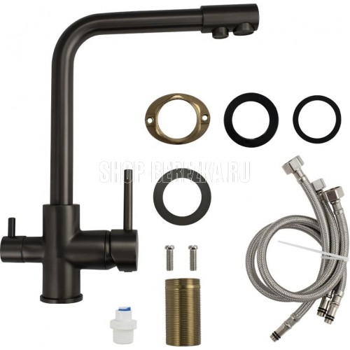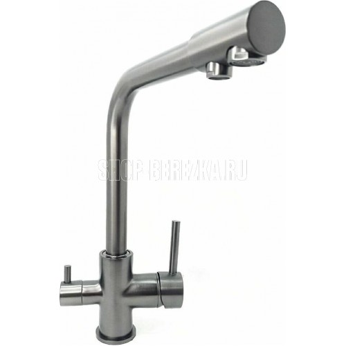 Смеситель для кухонной мойки и раковин, с двойным выпуском воды для фильтра, литой корпус, цвет - ГРАФИТ, из латуни, с высоким Г-образным изливом, шаровый, с отдельным переключением от фильтра и проточной воды. Крепление резьба - гайка, картридж d = 40 мм, ручка шток. Аэратор для экономии воды. Такая модель может использоваться на домашней кухне, на даче, в медицинских учреждениях и общественных местах. Габаритные размеры: высота 300 мм, длина 220 мм, размер посадочного седла 45 мм, длина резьбы 45 мм, длина подводки 450 мм. Вес - 2.400 кг, объём - 0,008 м3. В комплекте паспорт, корпус с изливом, подводка 1/2, крепеж, набор прокладок.