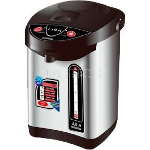 объем 3,8 л, мощность 800 Вт, 220В/50Гц, корпус и колба из нержавеющей стали, 3 способа подачи воды: при нажатии чашкой на клапан, с помощью насоса, с помощью электропомпы, Функция повторного кипячения, Ручка для переноски, Индикатор уровня воды.
