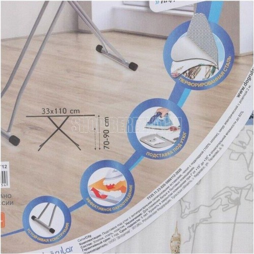Рабочая поверхность 110х33см. Регулировка высоты 70-90см. Чехол (100% хлопок). Подкладка под чехол поролон.