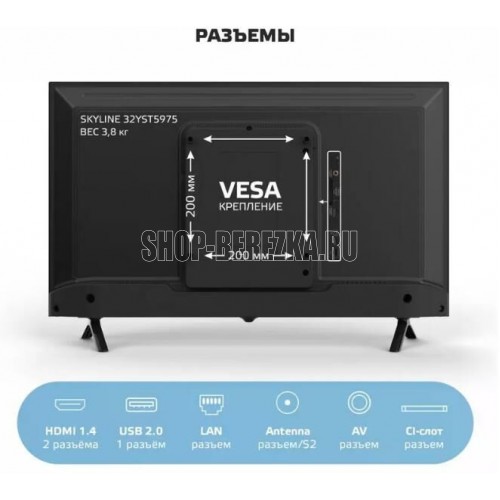 Диагональ экрана32/81 Системы цветности аналогового ТВSECAM / PAL Системы цветности для AVSECAM / PAL Цифровой тюнер DVB-T/T2да Функция SMARTда Версия ОСA Frameless ЯНДЕКС AOSP 9.0 1RAM + 8Gb ROM Декодеры стереозвукаA2 / NICAM Формат изображения16: 9 Разрешение экранаHD READY 1366x768 Динамический контраст70000: 1 Яркость230 Угол обзора (гор/верт)178/178 Цифровой 3D фильтрда Количество цветов16,7 млн. Время отклика8 мс Меню на русском, английском языкахда Телетекстда Звук мощность2x6 Вт Антенный входда Композитный AV вход / CVBS+ Audio R/Lда Аудио выход 3.5 ммда Аудио вход для ПКда HDMI3 x 1.4 Цифровой аудио выход / Digital Audio Outда USBUSB 2.0 x 2 SCARTда VGAда СI слотда Напряжение110-240V 50/60 Гц Макс. потребляемая мощность48 Вт Потребляемая мощность в режиме ожидания0.5 Вт Вес с подставкой3.5 кг Вес без подставки3.2 кг Размеры с подставкой732x479x191 мм. Размеры без подставки732x434x75 мм.