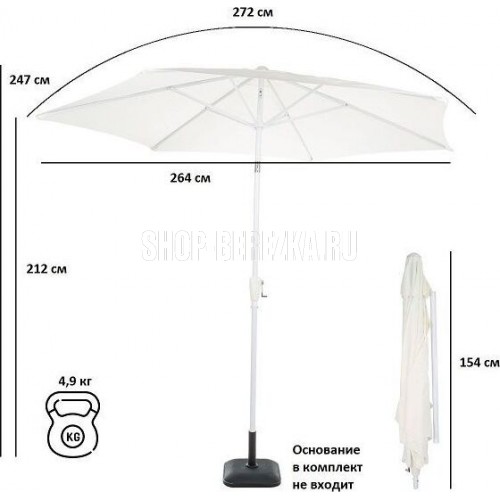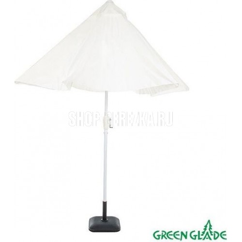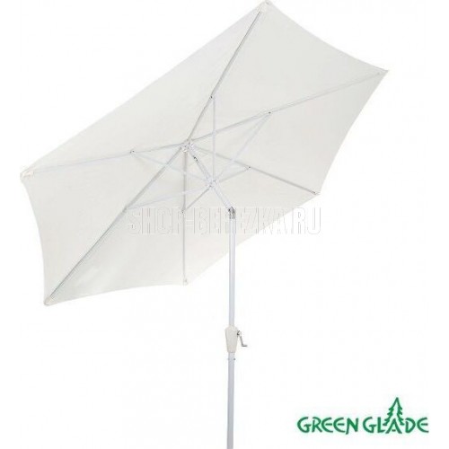 Зонт Green Glade – незаменим для отдыха на даче, загородном участке, около бассейна и на пляже. Он защитит вас и ваших детей в жаркий день от яркого солнца и создаст комфортную тень там, где вам необходимо. Купол имеет свойство наклона, поэтому его можно регулировать. Перед использованием зонт необходимо надежно закрепить в основание для зонта. Основание в комплект поставки не входит. • Длина дуги купола: 272 см • Диаметр: 264 см • Высота (общая/до купола): 247/212 см • Вес нетто: 4,9 кг • Стойка: сталь 34/36 мм • Наклонный механизм: цинковый • Количество спиц: 6 штук • Спица: 12х18 мм • Материал: 180G полиэстер • Система поворота • Вентиляция • Чехол п/э • Цвет: белый • Размер коробки: 155х13,5х13,5 см • Количество в коробке: 1 штука • Вес брутто: 5,5 кг • Производитель: Green Glade • Страна: Китай