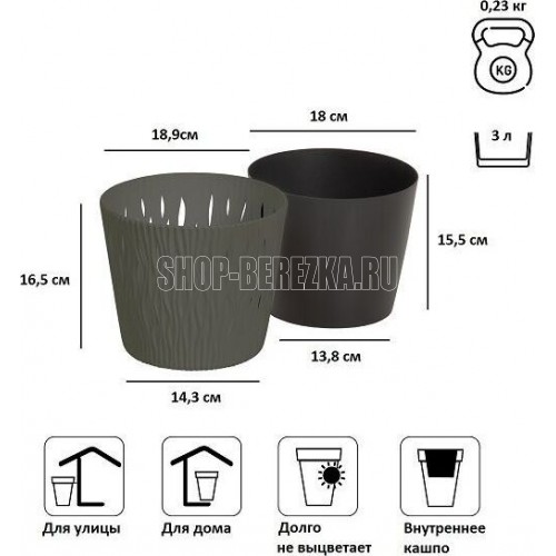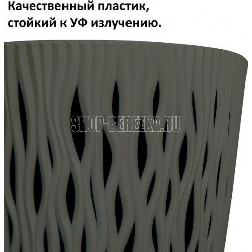Кашпо для цветов Sandy Round является замечательным украшением садового интерьера, дома, зоны отдыха. Благодаря прочному пластику изделие обладает устойчивостью к ультрафиолетовым лучам. Кашпо для цветов Sandy Round состоит из двух предметов: внутренней емкости, куда сажают растение, и декоративной емкости. • Комплектация: 2 предмета (внутренняя емкость + декоративная емкость) • Размер (ДМхВ): 189х165 мм • Объемы: 3 л • Цвет: серый • Материал: пластик • Вес брутто: 0,225 кг • Количество в упаковке: 5 штук • Производитель: Prosperplast • Страна: Польша
