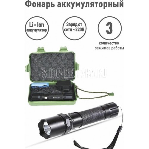 Фонарь электрический светодиодный аккумуляторный. Цвет корпуса: черный. Работает от аккумулятора Li-Ion типа 18650 или от батареек 3 X ААA. Материал корпуса - алюминиевый сплав 6063/T6 с анодированным защитным покрытием II типа высокой степени жесткости. Источник света - светодиод CREE XP-E с потребляемой мощностью 1 ватт с цветовой температурой 6000К со световым потоком 80 люмен. Дистанция освещения - до 40 метров. 3 режима работы - 100% / 30% / мигающий. Выключатель - трехпозиционный кнопочного типа (с защитной резиновой накладкой) на корпусе фонаря. Время работы при полностью заряженном аккумуляторе: режим 100% - до 3 часов, режим 30% - до 5 часов, мигающий - до 5 часов. Время заряда аккумулятора - 4 часа. Степень пыле-влаго-защиты IP66.
