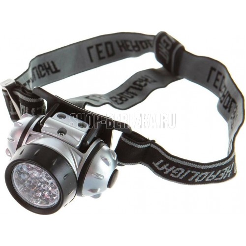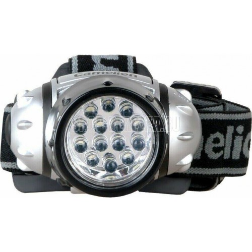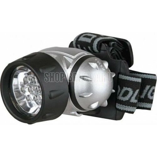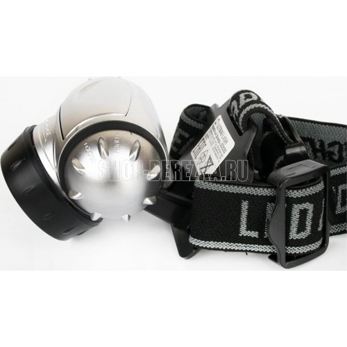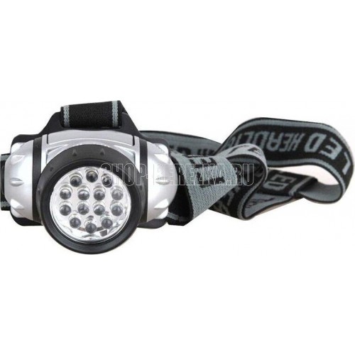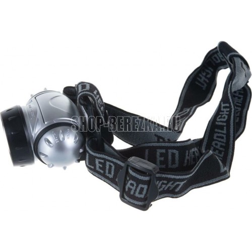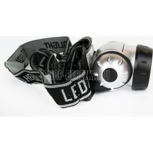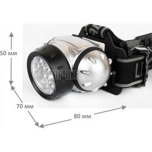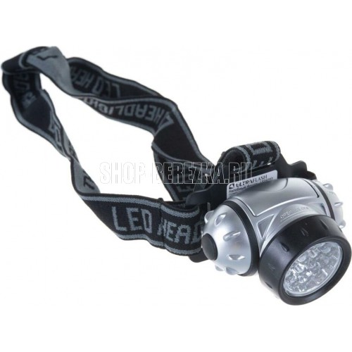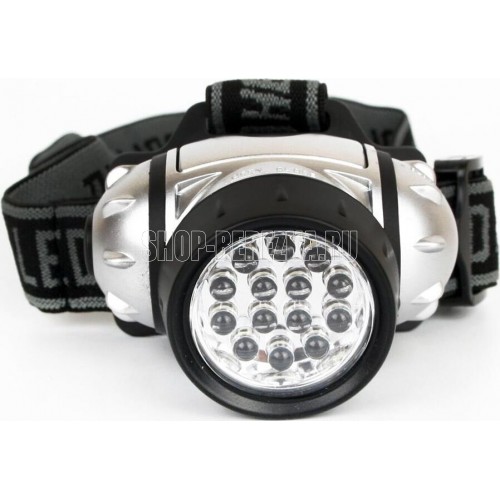 Фонарь электрический светодиодный налобный. Цвет корпуса: серебро + чёрный. Работает от 3 X AAA батареек (не входят в комплект). Материал корпуса - пластик. Источник света - 14 светодиодов с рассеивающими линзами с цветовой температурой 6500К со световым потоком 30 люмен. Дистанция освещения - до 20 метров. Четыре режима работы. Выключатель -четырёхпозиционный кнопочного типа. Время работы при использовании солевых батареек: 4 светодиода - до 33 часов, 8 светодиодов - до 22 часов, 14 светодиодов - до 18 часов, 18 светодиодов в мигающем режиме - до 80 часов. Степень пыле-влаго-защиты IP44.