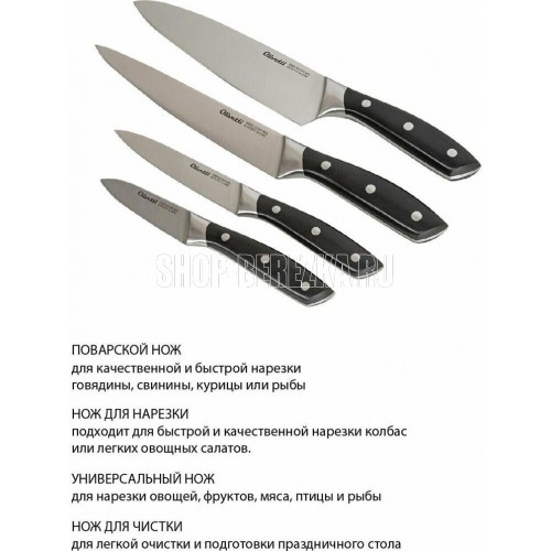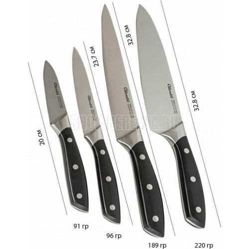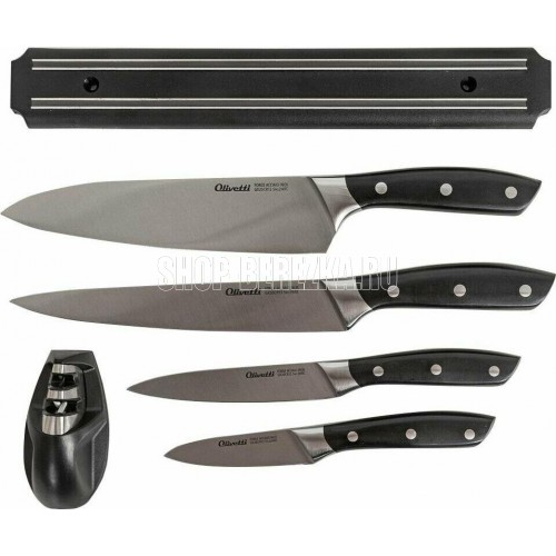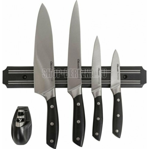 Комплект кухонных ножей с магнитной планкой и точилкой. Включает: поварской нож, нож для нарезки, универсальный нож, нож для чистки овощей, настенную магнитную планку и универсальную точилку для ножей Нержавеющая сталь для ножей GX30Cr13, твердость по шкале Роквела 54±2 HRC . Цельнокованый клинок. Двусторонняя долговечная заточка * Эргономичная рукоятка из прочного ABS пластика . Манитная планка для настенного хранения ножей. Механическая точилка для двухэтапной правки ножей. Надежная подарочная упаковка.