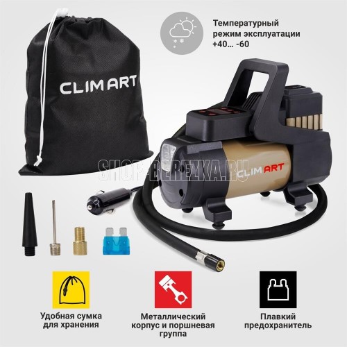 Автомобильный компрессор " Мощность: 168 Вт " Производительность: 35 л / мин " Давление: до 9 Атм " Максимальное токопотребление: 14 А " Питание: 12V " Длина провода питания: 3 м " Длина воздушного шланга: 1 м " Температура эксплуатации: -40… + 60 С° " Защита: плавкий предохранитель " Материал: Сталь " Вес: 1,50 кг " Объем: 0,002 куб.м " Металлическая поршневая группа " Высокоточный цифровой манометр " Функция автоматического отключения по достижению заданного давления " Универсальный автомобильный предохранитель в капсуле " Время непрерывной работы: 30 мин " Сумка-мешок для хранения и переноса компрессора " Переходники в комплекте " Фонарь Питается автокомпрессор от прикуривателя. Автомобильный предохранитель в капсуле защищает устройство и сеть автомобиля от скачков напряжения в случае нештатной работы компрессора.