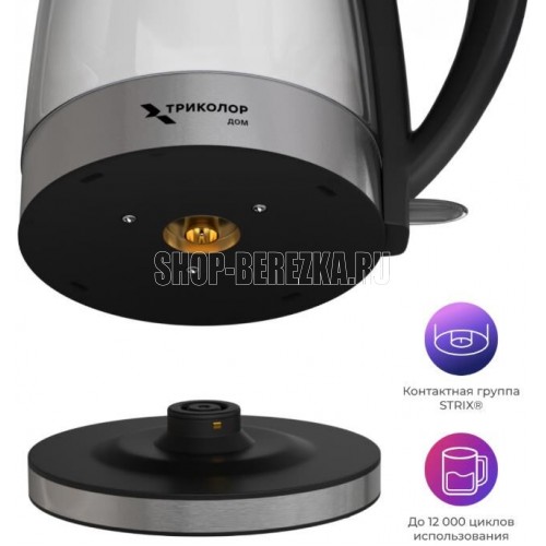 Объем 1,7 л. Нагревательный элемент Дисковый. Материал Нержавеющая сталь, стекло, пластик. Органы индикации Светодиодная. Автоотключение при закипании воды,при отсутствии воды, при снятии с подставки. Напряжение питания 220-240 В, 50 Гц. Защита от поражения электротоком Класс 1. Вращение на подставке 360°. Длина электрошнура 0,72 м. Отсек для хранения электрошнура Есть.