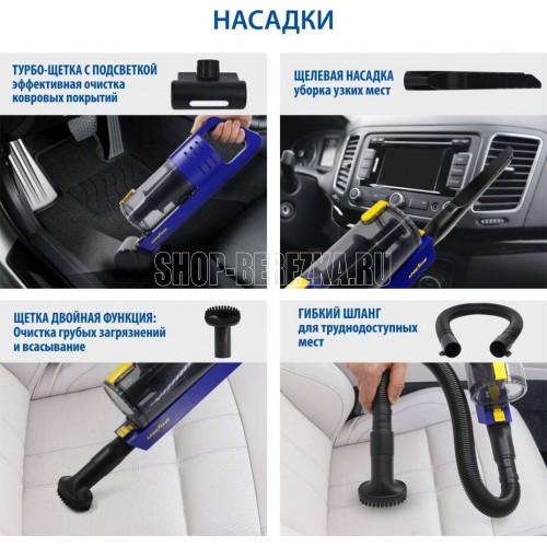 Автомобильный пылесос с питанием от прикуривателя. Высокая мощность всасывания - 5500 Pa. Многоразовый моющийся HEPA фильтр. Насадки для эффективной очистки различных загрязнений. Гибкий шланг-удлинитель для уборки в труднодоступных местах. Длина провода - 4 м. Емкость пылесборника: 480 мл. Низкий уровень шума. Мешок для компактного хранения. Расширенная гарантия - 3 года. Пылесос с фильтром Нера. Гибкий шланг. Насадка-щетка. Турбо-щетка. Щелевая насадка. Переходник. Шнур питания. Мешок для хранения. Инструкция. Мощность: 80 Вт. Мощность всасывания: 5500 Pa. Напряжение питания: 12 V. Длина провода питания: 4 м. Емкость пылесборника: 480 мл. Вес: 1,45 кг. Габариты ДхШхВ: 390х160х210 мм