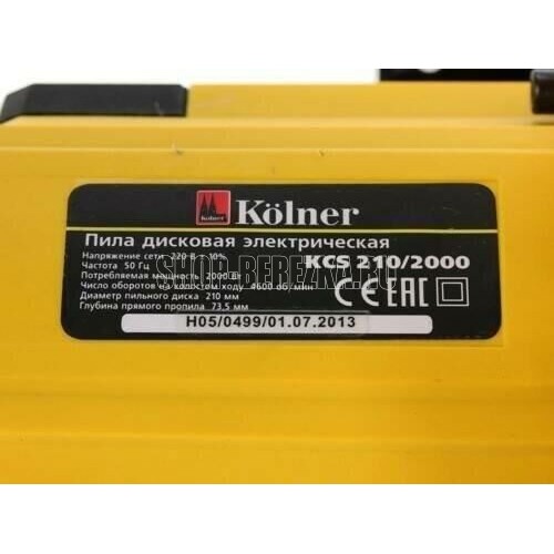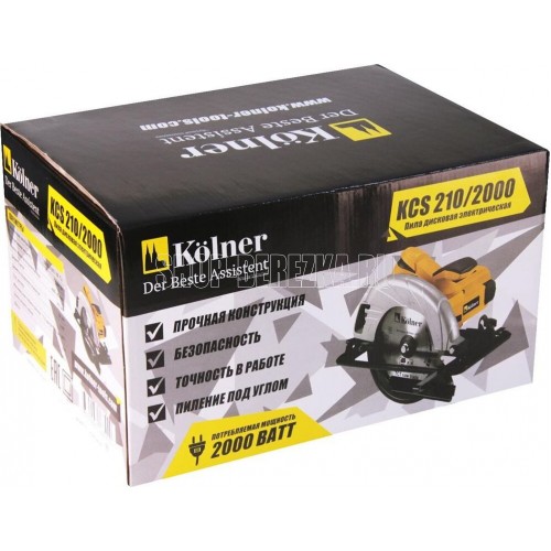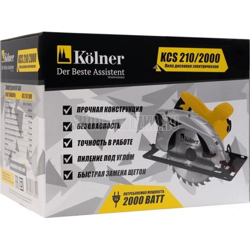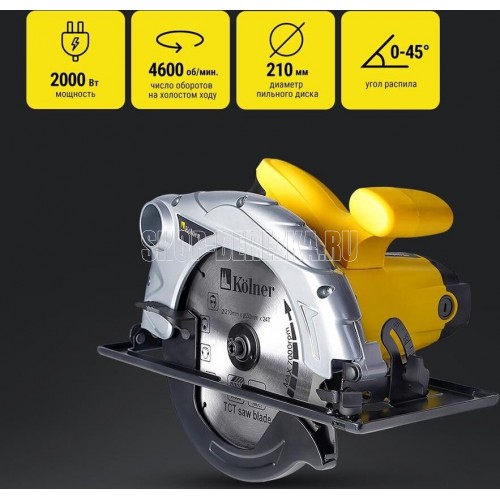 Циркулярная пила KOLNER KCS 210/2000: Напряжение сети / Частота: 220±10%/50 В/Гц. Потребляемая мощность: 2000 Вт. Число оборотов на холостом ходу: 4600 об/мин. Диаметр пильного диска: 210 мм. Диаметр посадочного отверстия: 30 мм. Угол распила: 0-45°. Максимальная глубина пропила: 73,5 мм (90°) / 52 мм (45°) мм. Длина сетевого кабеля: 2 м.