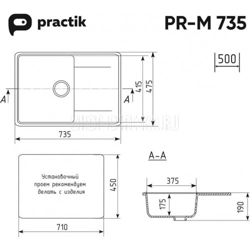 Односекционная реверсивная мойка Practik PR-M 735 с плоским крылом является оборачиваемой - крыло может располагаться как справа,так и слева. Материал мойки представляет из себя искусственный камень, который является композитом на основе натурального мрамора и связующих смол. Искусственный камень существенно снижает уровень шума при падении струи воды. Специальное покрытие гелькоут защищает поверхность мойки от загрязнений и бытовых царапин, делая уход за мойкой легким и простым. Данная мойка имеет устанавливается в шкаф от 50 см и дает возможность осуществить монтаж мойки в стандартную столешницу шириной 60 см, а также открывает широкий спектр возможностей при проектировании кухни. Заводская гарантия составляет 1 год, а срок службы данной мойки, при соблюдении основных правил ухода за ней, составляет более 10 лет.