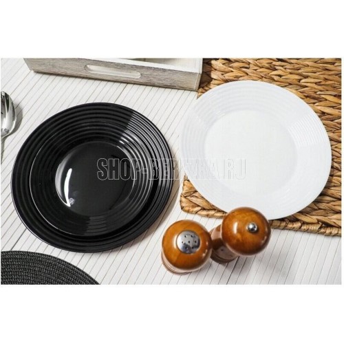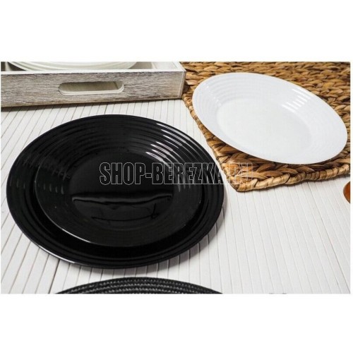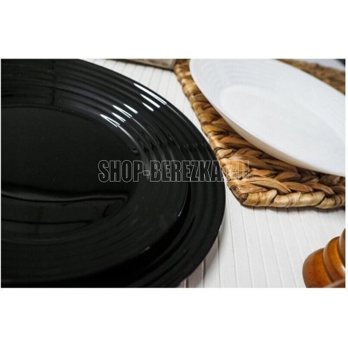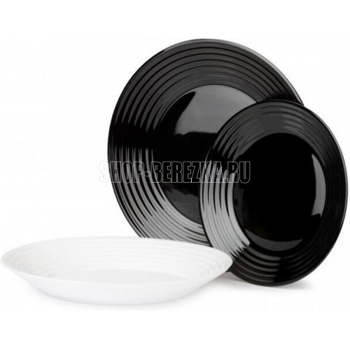 Тарелка обеденная черная 25 см - 6 шт.Тарелка десертная черная 19 см - 6 шт. Тарелка суповая белая 23 см - 6 шт.Материал Стекло.Можно мыть в посудомоечной машине.Можно использовать в СВЧ.