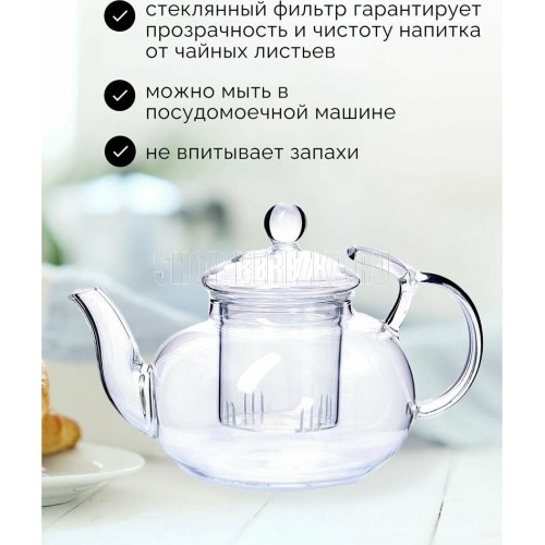 Чайник заварочный МВ(х16). Материал: термостойкое стекло. Объем: 650 мл. Вес: 425 г. Размер упаковки: 15,4 х 15,4 х 13 см. Упаковка: коробка. Страна производитель: Китай.