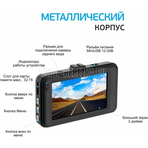 Двухканальное видео высокого качества. Видеозаписи в формате Full HD-видео (1920x1080) при 30 к/с. Прочный металлический корпус. Циклическая запись 2/3/5 мин. MicroHDSC карты (до 32 Гб). Фото до 12 Мп (4352 х 3264). Угол обзора 120 градусов. Дисплей 3.0.