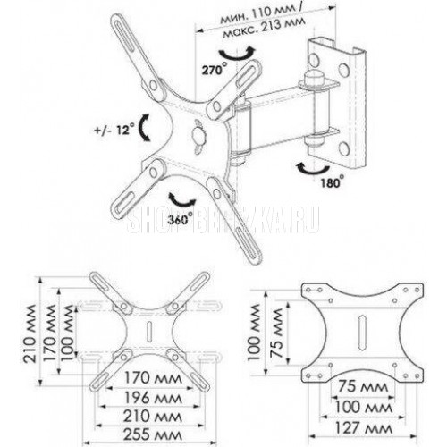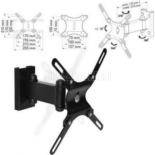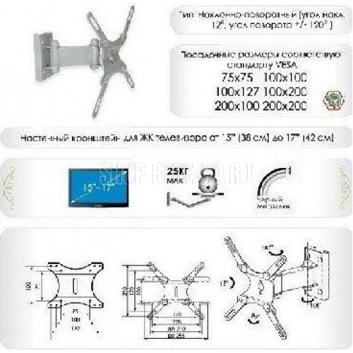 Наклонно-поворотный. Для ЖК монитора от 15” до 26”. нагрузка до 25 кг. Материал: сталь. Цвет: черный. Стандарт VESA: 75*75, 100*100, 100*127, 100*200, 200*100, 200*200