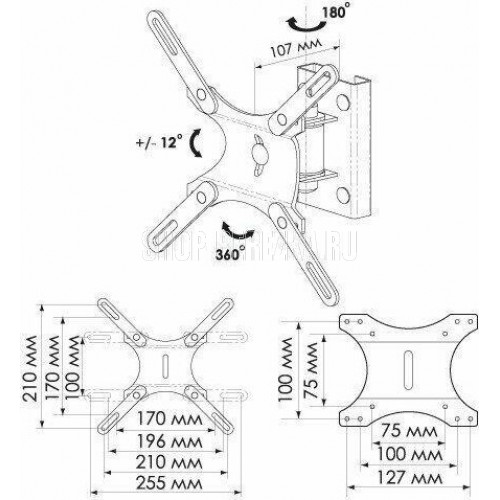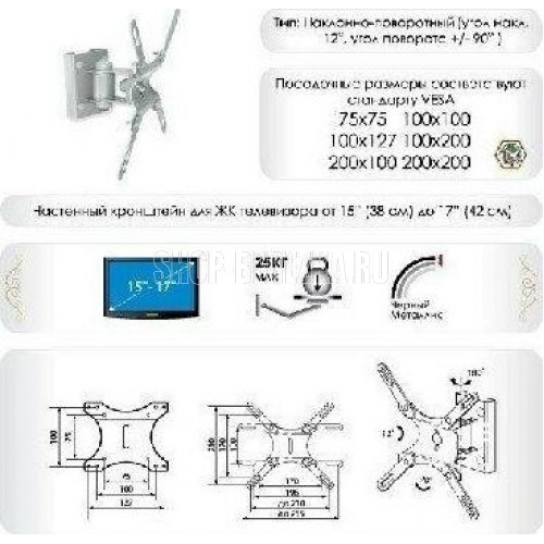 Наклонно-поворотный. Кронштейн ЖК 701 предназначен для крепления на стену LCD, LED, ЖК телевизора с VESA 200*200, 200*100, 100*200, 100*127, 100*100, 75*75, весом до 25кг. Угол наклона - 12 °. Угол наклона + 12 °. Угол поворота + - 90 °.