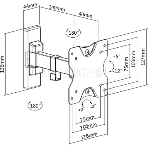 Диагональ экрана: 13"-27". VESA: 75x75, 100x100. Максимальная нагрузка: 20 кг. Расстояние от стены: 50-180 мм. Угол поворота: +90°~-90°. Угол наклона: +5°~-12°. Уровень экрана: +3°~-3°. Материал: холоднокатаная сталь, пластик. Протестировано весом в 2 раза больше максимально допустимого. Плавно и легко наклоняется и поворачивается на шарнирах. Встроенная регулировка уровня и индикатор поворота. Конструкция панели с VESA съёмная для лёгкой установки.