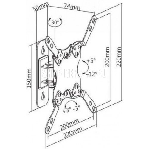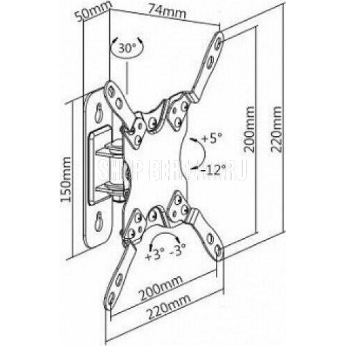 Наклонно-поворотный. Диагональ экрана: 13"-43". Подходит для изогнутых экранов. VESA: 75x75, 100x100, 200x100, 200x200. Максимальная нагрузка: 20 кг. Расстояние от стены: 74 мм. Угол поворота: +15°~-15°. Угол наклона: +5°~-12°. Горизонт экрана: +3°~-3°. Материал: холоднокатаная сталь. Протестировано весом в 2 раза больше максимально допустимого. Плавно и легко наклоняется и поворачивается. Конструкция свободного наклона. Встроенная регулировка уровня и индикатор поворота. Конструкция панели с VESA съёмная для лёгкой установки. Декоративные накладки для кабеля.