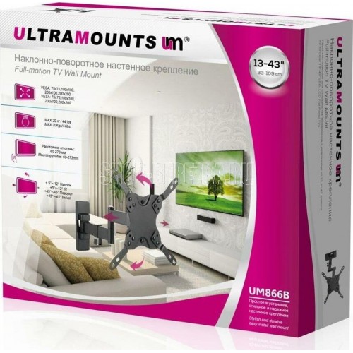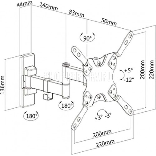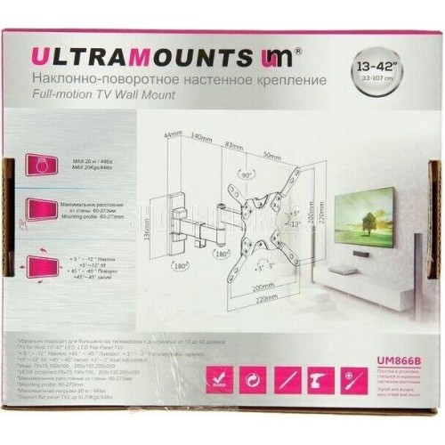 Диагональ экрана: 13"-43". Подходит для изогнутых телевизоров. VESA: 75x75, 100x100, 200x100, 200x200. Максимальная нагрузка: 20 кг. Расстояние от стены: 60-273 мм. Угол поворота экрана: +45°~-45°. + 2 шарнирных соединения (колена). с углом поворота 180°. Угол наклона: +5°~-12°. Горизонт экрана: +3°~-3°. Материал: холоднокатаная сталь, пластик. Протестировано весом в 2 раза больше максимально допустимого. Плавно и легко наклоняется и поворачивается. Конструкция свободного наклона. Встроенная регулировка уровня и индикатор поворота. Конструкция панели с VESA съёмная для лёгкой установки. Направляющая кабеля.