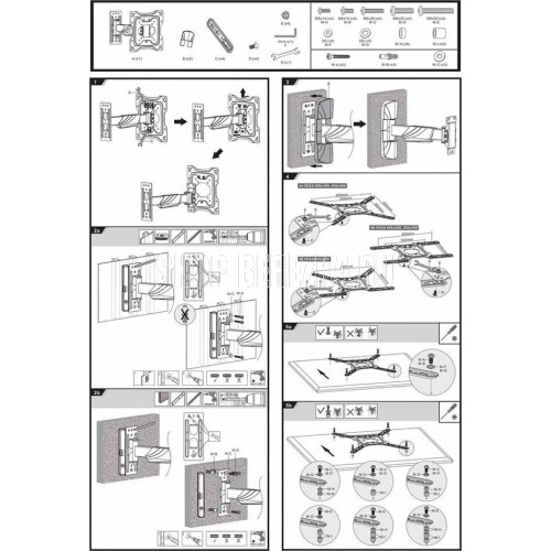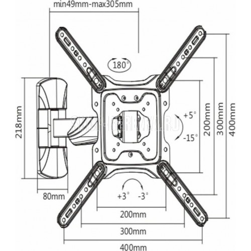 Диагональ экрана: 23"-55". Подходит для изогнутых телевизоров. VESA: 75x75, 100x100, 200x100, 200x200, 300x200, 300x300, 400x200, 400x300, 400x400. Максимальная нагрузка: 35 кг. Расстояние от стены: 49-305 мм. Угол поворота: +90°~-90°. Угол наклона: +5°~-15°. Горизонт экрана: +3°~-3°. Материал: холоднокатаная сталь, пластик. Протестировано весом в 3 раза больше максимально допустимого. Плавно и легко наклоняется и поворачивается на шарнирах. Конструкция свободного наклона. Встроенная регулировка уровня и индикатор поворота. Декоративные накладки для кабелей.