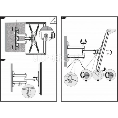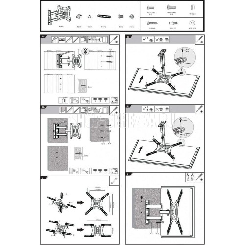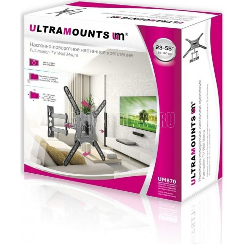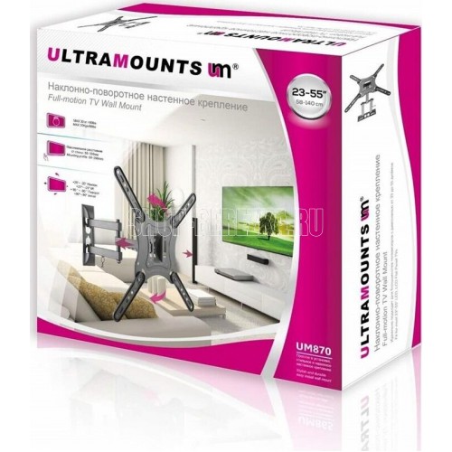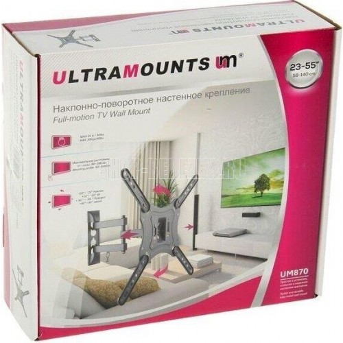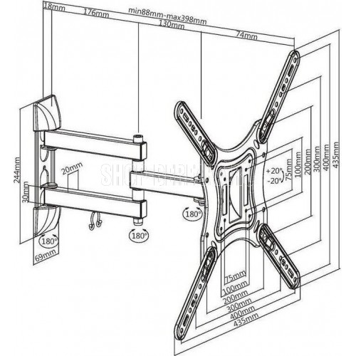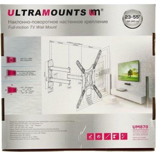 Диагональ экрана: 23"-55". VESA: 75x75, 100x100, 200x100, 200x200, 300x300, 400x200, 400x400. Максимальная нагрузка: 30 кг. Расстояние от стены: 88-398 мм. Угол поворота: +90°~-90°. Угол наклона: +20°~-20°. Материал: холоднокатаная сталь. Протестировано весом в 2 раза больше максимально допустимого. Конструкция свободного наклона. Направляющая для кабелей.