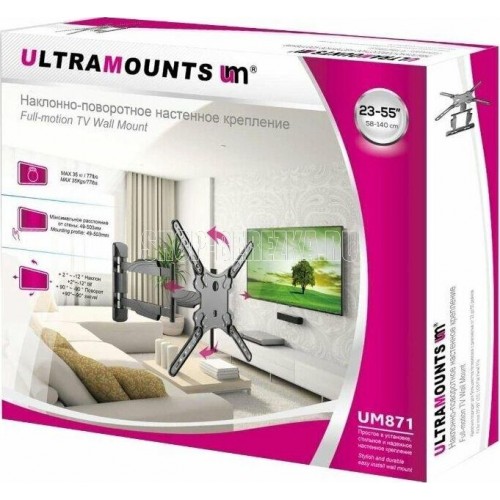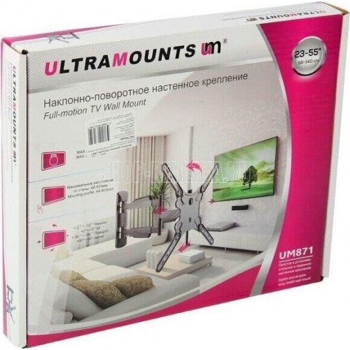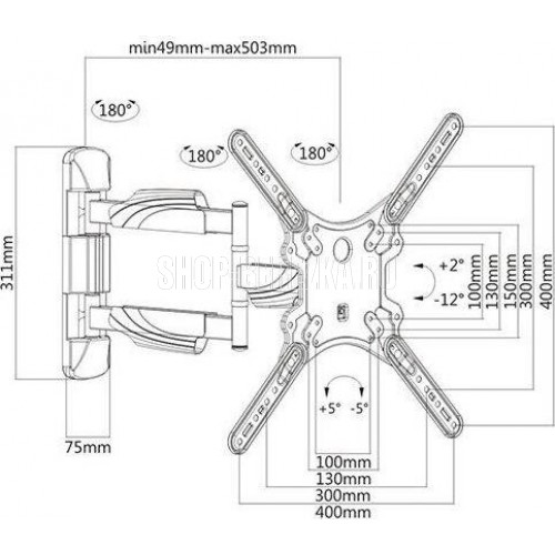 Диагональ экрана: 23"-55". * Подходит для изогнутых телевизоров. VESA: 100x100, 100x150, 200x100, 200x200, 300x200, 300x300, 400x200, 400x300, 400x400. Максимальная нагрузка: 35 кг. Расстояние от стены: 49-503 мм. Угол поворота: +90°~-90°. Угол наклона: +2°~-12°. Горизонт экрана: +5°~-5°. Материал: холоднокатаная сталь, пластик. Протестировано весом в 3 раза больше максимально допустимого. Плавно и легко наклоняется и поворачивается на шарнирах. Конструкция свободного наклона. Встроенная регулировка уровня и индикатор поворота. Декоративные накладки для кабелей. Конструкция панели с VESA съёмная для лёгкой установки.