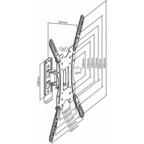 Диагональ экрана: 32"-55". VESA: 100x100, 100x200, 200x100, 200x200, 300x200, 300x300, 400x200, 400x300, 400x400. Максимальная нагрузка: 30 кг. Расстояние от стены: 82 мм. Угол поворота: +15°~-15°. Угол наклона: +3°~-10°. Материал: холоднокатаная сталь, пластик. Протестировано весом в 2 раза больше максимально допустимого. Открытая конструкция с улучшенной вентиляцией и облегчённым доступом к проводам. Удобная регулировка и фиксация угла наклона.