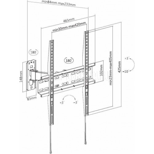 Диагональ экрана: 32"-55". VESA: 200x200, 300x200, 300x300, 400x200, 400x300, 400x400. Максимальная нагрузка: 35 кг. Расстояние от стены: 84-233 мм. Угол поворота: +90°~-90°. Угол наклона: +3°~-10°. Горизонт экрана: +3°~-3°. Материал: холоднокатаная сталь, пластик. Протестировано весом в 2 раза больше максимально допустимого. Плавно и легко наклоняется и поворачивается на шарнирах. Конструкция свободного наклона. Встроенная регулировка уровня и индикатор поворота. С помощью автоматических защёлок телевизор надёжно фиксируется на настенном крепеже и легко снимается, нужно просто потянуть за шнуры разблокировки замков.