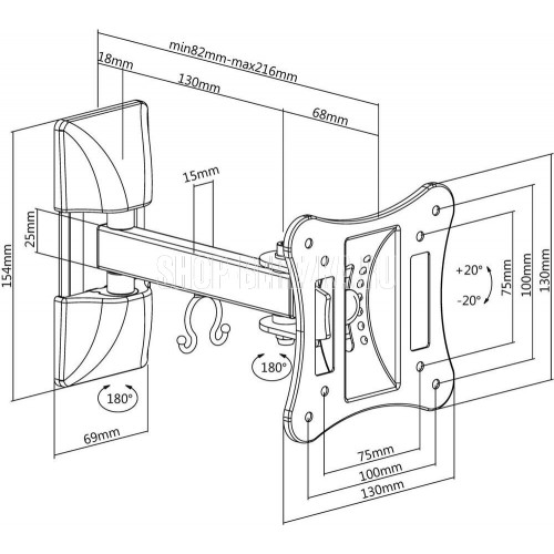 Диагональ экрана: 13"-27". VESA: 75x75,100x100. Максимальная нагрузка: 15 кг. Расстояние от стены: 82~216 мм. Угол поворота: +90°~-90°. Угол наклона: +20°~-20°. Материал: холоднокатаная сталь. Протестировано весом в 2 раза больше максимально допустимого. Направляющие кабеля позволяют их скрыть. Свободная настройка угла поворота с широким диапазоном.