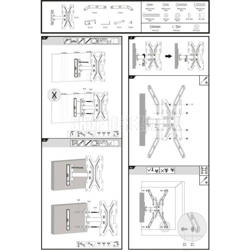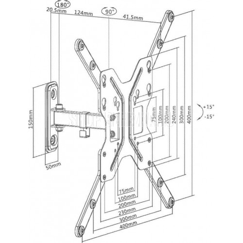 Диагональ экрана: 23"-55". VESA: 75x75,100x100,200x100,200x200,300x300,400x400. Максимальная нагрузка: 30 кг. Расстояние от стены: 49~186 мм. Угол поворота: +45°~-45°. Угол наклона: +15°~-15°. Материал: холоднокатаная сталь. Движение по нескольким осям обеспечивает максимальную гибкость - можно наклонять и поворачивать телевизор для удобного просмотра с любого места в комнате. Конструкция свободного наклона - меняйте угол без инструментов. Кабель-канал придаст более аккуратный вид Вашему TV.