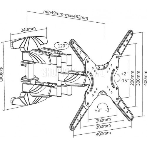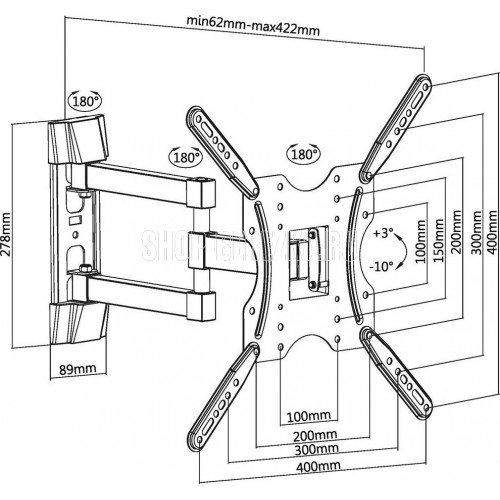 Диагональ экрана: 32"-55". VESA: 100x100, 200x100, 200x200, 300x200, 300x300, 400x200, 400x400. Максимальная нагрузка: 30 кг. Расстояние от стены: 62~422 мм. Угол поворота: +90°~-90°. Угол наклона: +3°~-10°. Материал: холоднокатаная сталь. Движение по нескольким осям обеспечивает максимальную гибкость - можно наклонять и поворачивать телевизор для удобного просмотра с любого места в комнате. Открытый дизайн обеспечивает лучшую вентиляцию и более легкий доступ к проводам.
