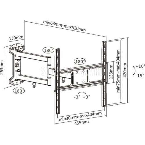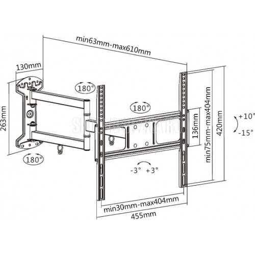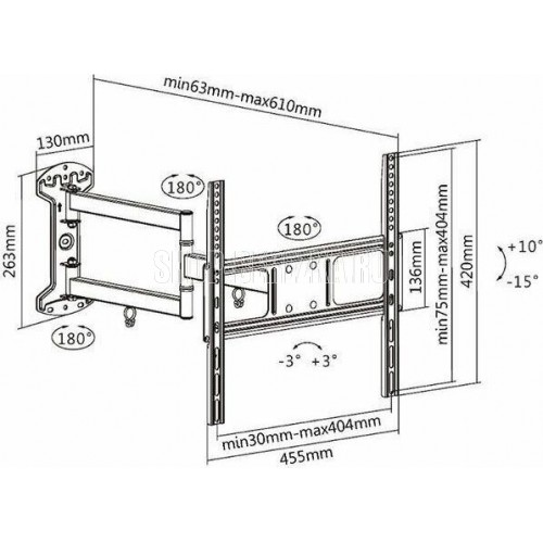 Диагональ экрана: 32"-55". VESA: 200x200, 300x300, 400x200, 400x400. Максимальная нагрузка: 35 кг. Расстояние от стены: 63~610 мм. Угол поворота: +90°~-90°. Угол наклона: +10°~-15°. Регулировка уровня: +3°~-3°. Материал: холоднокатаная сталь. Протестировано с весом, превышающим заявленный максимальный в 2 раза Движение по нескольким осям обеспечивает максимальную гибкость - можно наклонять и поворачивать телевизор для удобного просмотра с любого места в комнате. Регулировка уровня после установки обеспечивает идеальное расположение телевизора на стене. Конструкция свободного наклона. Кабель-канал поможет навести порядок в проводах, подключенных к телевизору.