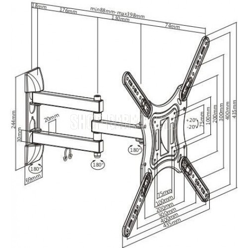 Диагональ экрана: 23"-55". VESA: 75x75, 100x100, 200x100, 200x200, 300x300, 400x200, 400x400. Максимальная нагрузка: 30 кг. Расстояние от стены: 88-398 мм. Угол поворота: +90°~-90°. Угол наклона: +20°~-20°. Материал: холоднокатаная сталь. Протестировано весом в 2 раза больше максимально допустимого. Конструкция свободного наклона. Направляющая для кабелей.