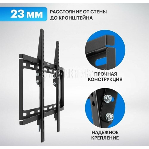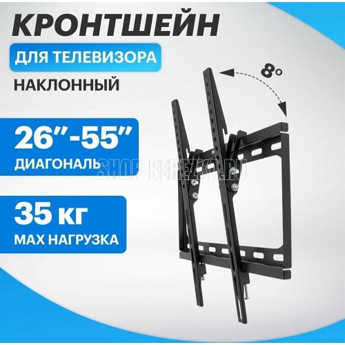 "Технические характеристики: Тип: наклонный Цвет: черный глянец Мин. диагональ: 26 дюймов Макс. диагональ: 55 дюймов Максимальный вес оборудования: 35 кг Установка: на стену Расстояние от стены до кронштейна: 23 мм VESA: 50x50/75x75/100x100/200x200/300x300/400?400 мм Угол наклона: 0°/-8°"